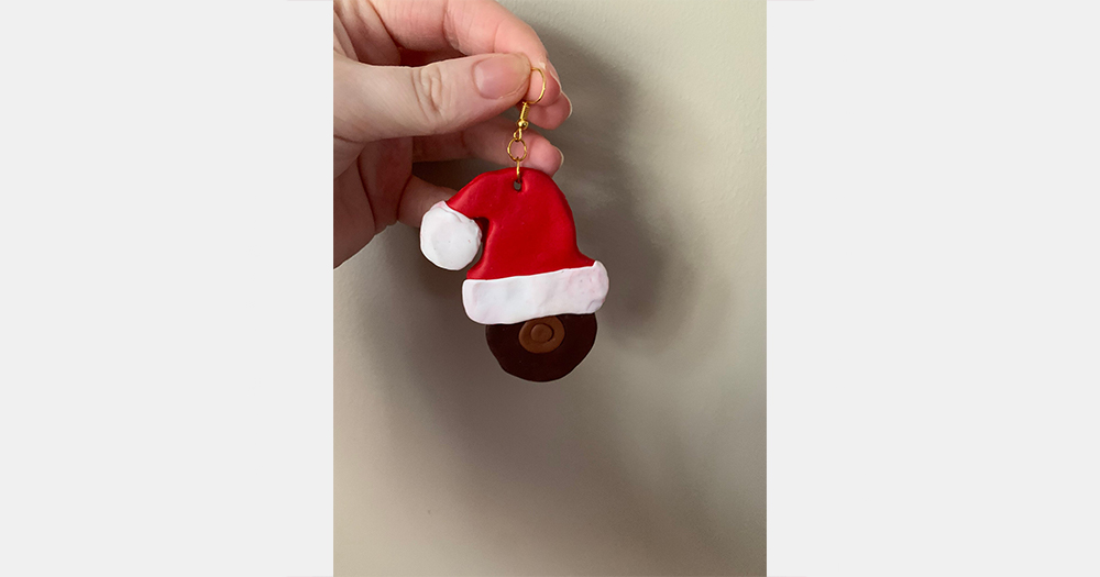 Handmade large polymer clay earrings in a boob shape with Santa hat which is also available as a decoration. LulaBySophie makes jewellery, trinket trays and pins many of which are queer and feminist-themed.
