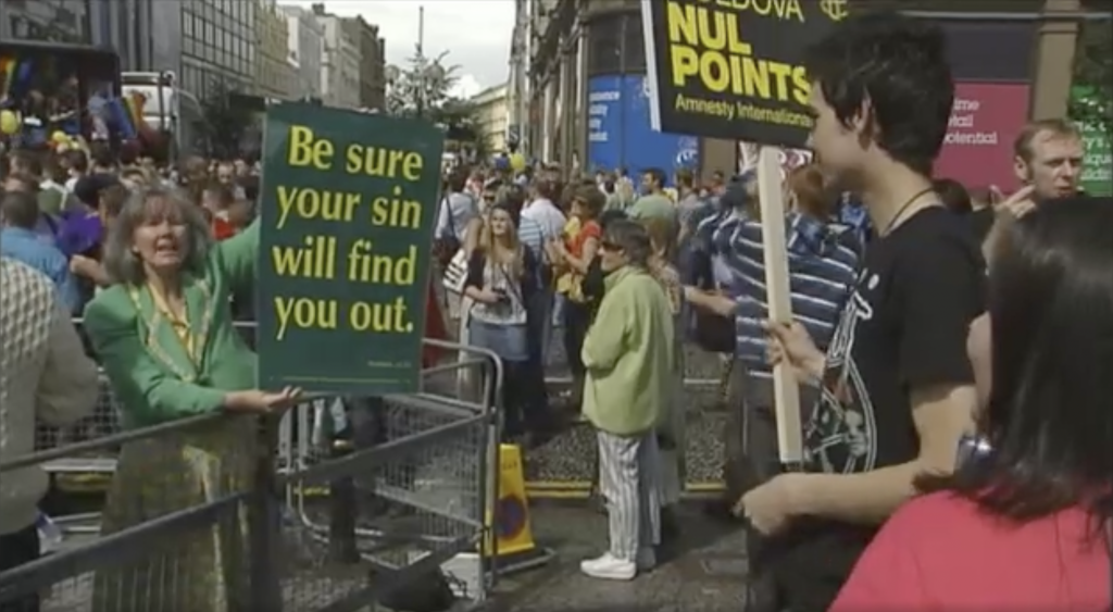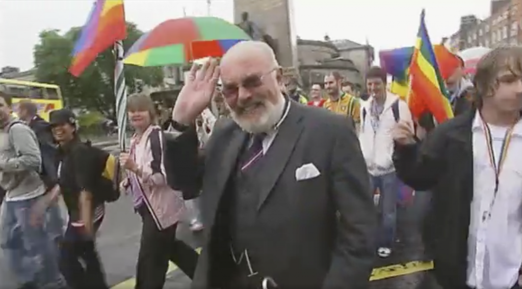 Amy O’Keefe, of the Dublin Pride Committee, appears in the clip saying that the parade serves to highlight the fact that gay people are being discriminated against. “We don’t have equal rights right now and we want them.” While Shirley Temple Bar tells the reporter, “We’ve dealt with worse than rain in our day.”