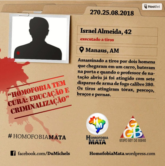 The homofobiamata website, which has taken to reporting every known anti-LGBT+ murder in Brazil has listed the 270th victim this year as Israel Almedia.