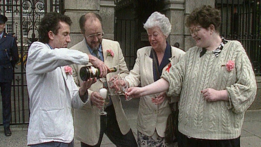 Campaigners celebrating the decriminalisation of homosexuality outside the Dáil in 1993 (photo: RTÉ)