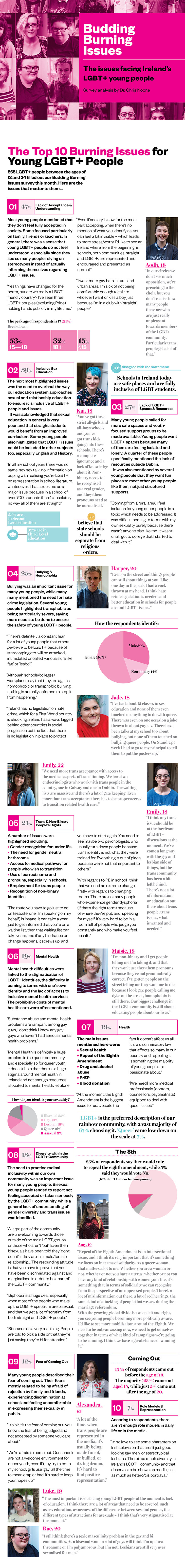 The Budding Burning Issues survey was carried out for the eighth annual Youth Issue of Ireland’s LGBT magazine, and published this week in association with BeLonG To, Ireland’s national LGBT+ youth organisation.