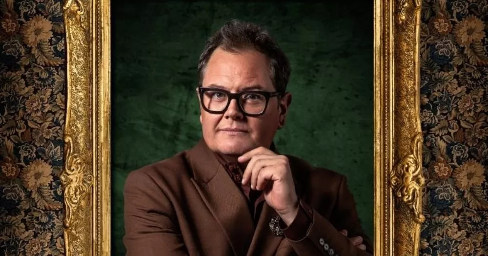 Alan Carr wins Celebrity Traitors. A portrait style picture of Alan Carr in a brown suit set against a green backdrop and in a golden frame.