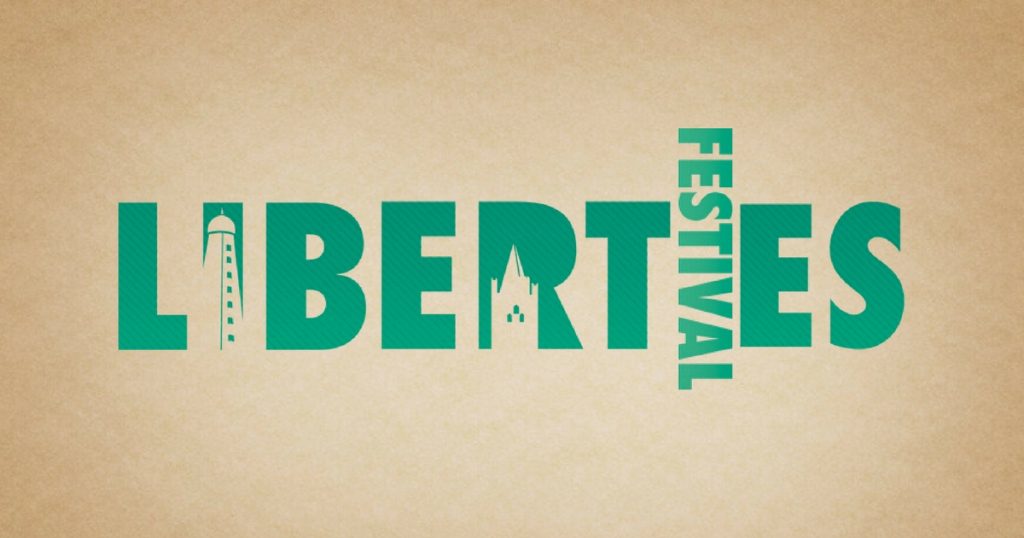 • The Limerick Pride logo over the words 2017, 10th-16th July which are in front of a giant rainbow flag in Limerick