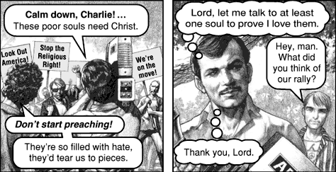 Entitled Doom Town, the pamphlet was written and illustrated by American cartoonist Jack Chick, known for his Christian evangelical fundamentalist works. It featured contemporary references to Sodom and Gomorrah framed as a “compassionate plea to repent of homosexuality”.