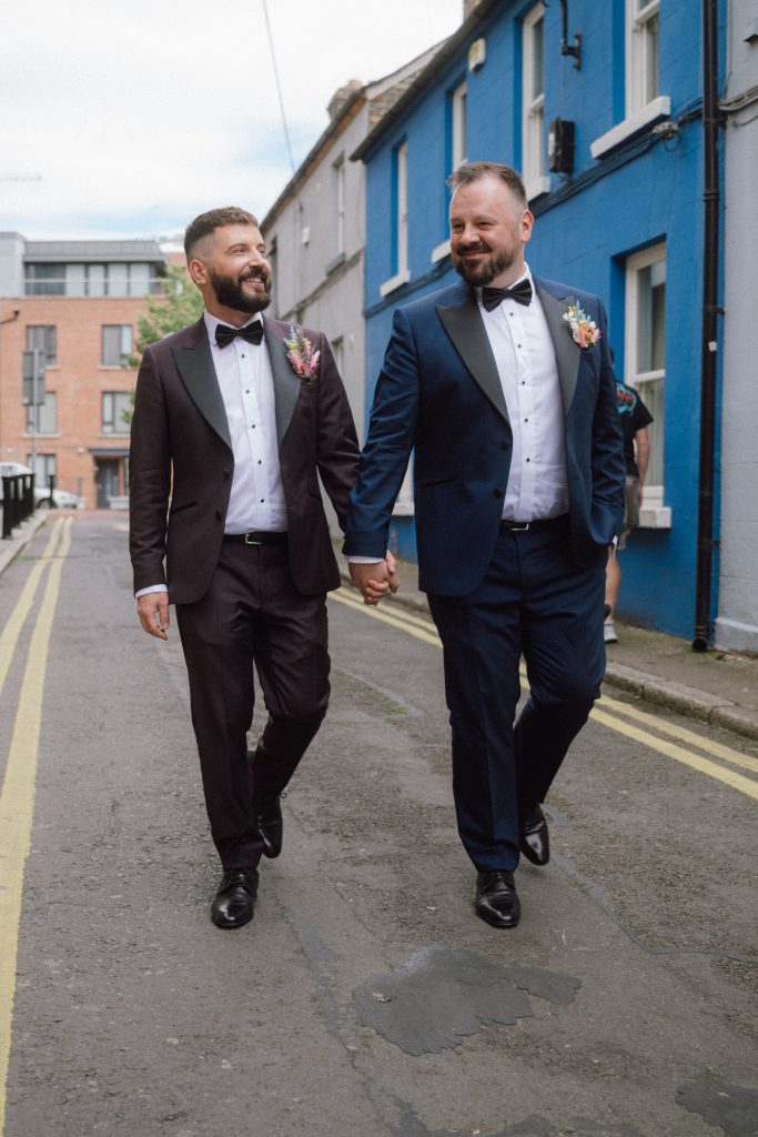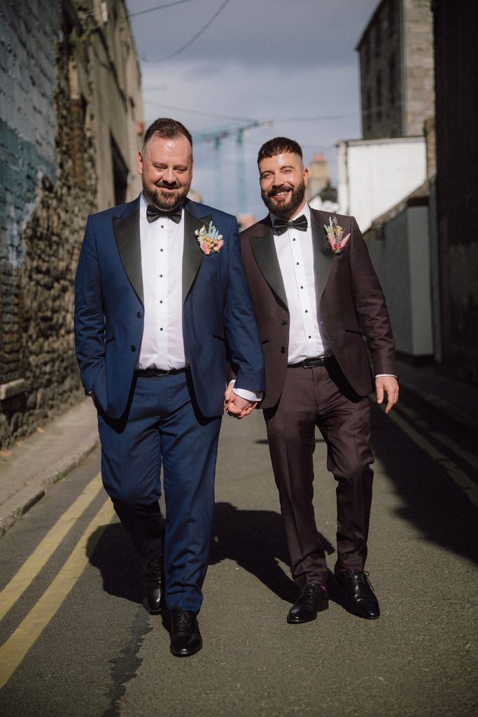 “They’re both very well fitted. We went for a skinny fit, but something that’s still timeless. It was important that we both felt like they were nice, classic suits with a bit of a modern twist, because the colours, mine especially, is not super conventional.”