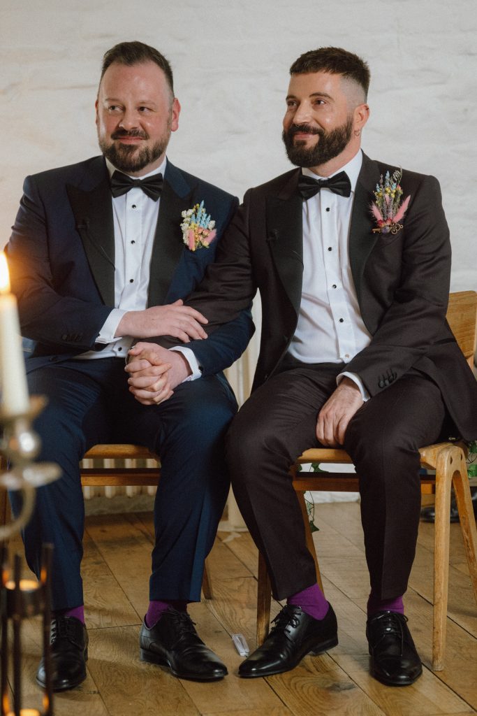 Remembering trying it on for the first time, Stefano said: “I have to say, probably the biggest sigh of relief in my entire wedding was when we saw the tuxes. I was like, ‘Oh my god, they’re actually gorgeous.’ They were hanging side by side, so as soon as we got in the shop, we could see that they looked great. Both Aaron and I got a bit emotional when we tried them on for the first time, which was lovely.”