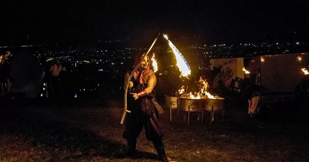 The image shows an individual celebrating Halloween, wearing a Celtic Samhain mask and dark clothing, holding a wooden fire torch. In the background are three metal tins with a bonfire, and more people in costume.