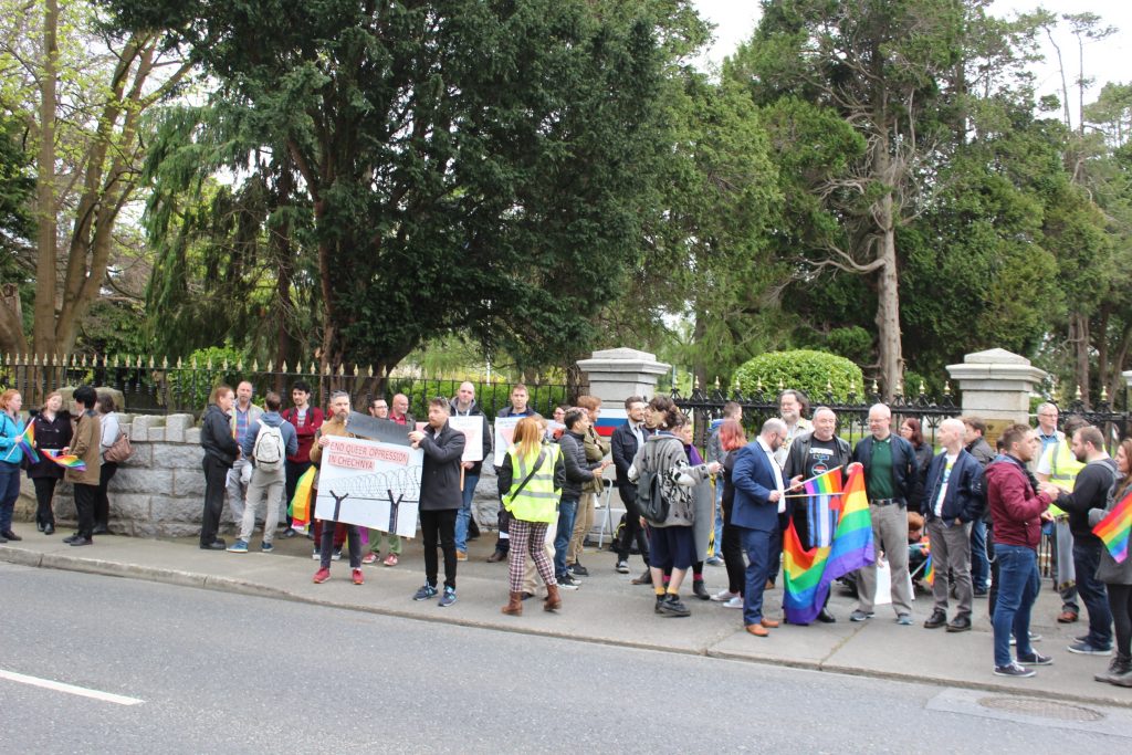 The National LGBT Federation (NXF) staged the largest-ever protest to take place outside the Russian Embassy in Dublin yesterday, to protest the reported detention, torture and murder of gay men in Chechnya.