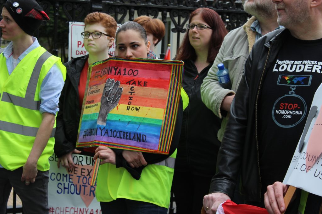 “The religious and socially conservative region of Chechnya is attempting to purge its society of gay men and Russia is so far turning a blind eye and allowing it to happen,” said protest organiser Dearbhla Mealy.