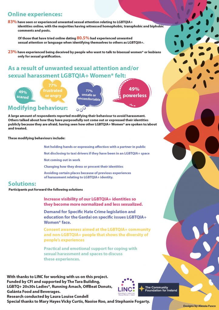 The research was conducted by Laura Louise Condell of Dublin Lesbian Line and was funded by the Community Foundation of Ireland. DLL conducted this research to publicly recognise and challenge sexual harassment of LGBTQIA+ Women*.