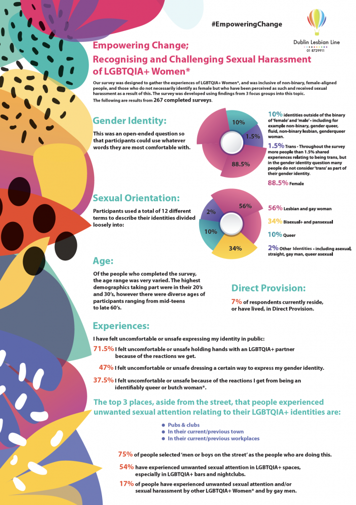 For the purpose of this research, sexual harassment included unsolicited and unwanted sexual language and behaviour. DLL conducted focus groups with LGBTQIA+ female participants of varying ages and identities who shared their experiences of sexual harassment in a safe space. They also conducted a survey in order to get a picture of the kinds of sexual harassment, if any, women* in the wider LGBTQAI+ community experience. The survey was developed using findings from 3 focus groups into this topic.