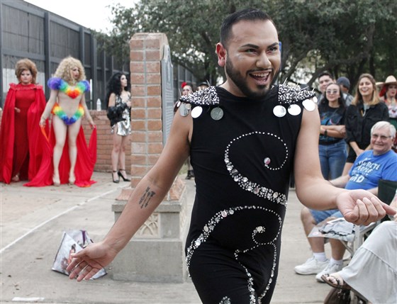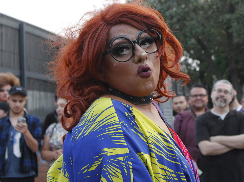 Beatrix Lestrange, a drag queen from Rio Grande Valley in south Texas, stood in front of a crowd wearing a multicoloured dress, red wig, black pumps and a choker with studs.