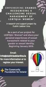 The Dublin Lesbian Line’s new research project is titled ‘Empowering change: Recognising and challenging sexual harassment of LGBTQIA women*’.  The organisers are looking for LGBTQIA women (female identified and non binary who prefer female spaces) to contact them and share their personal experiences of sexual harassment related to gender or sexual identity.