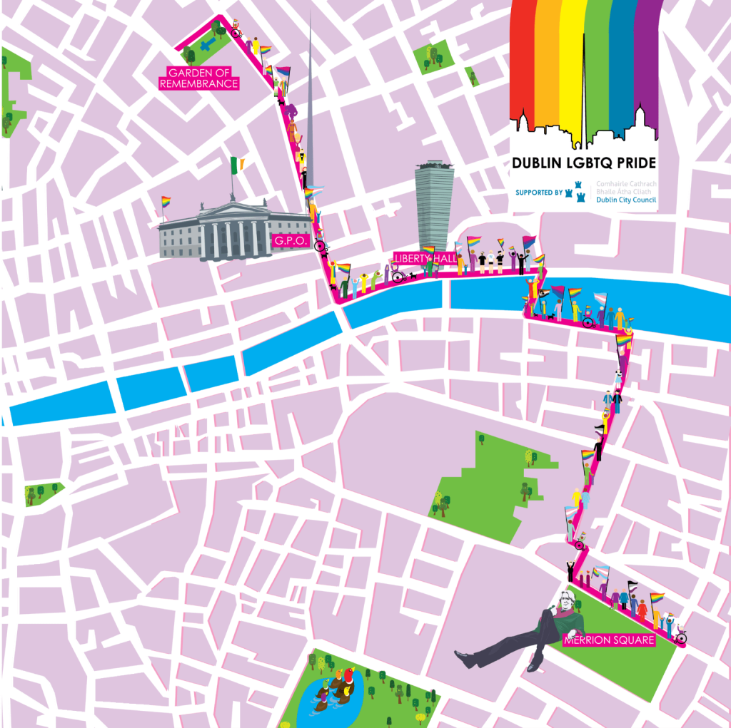 Kicking off at midday, marchers will assemble along O’Connell Street between the Garden of Remembrance and the GPO. From there, they will stride with pride down by Liberty Hall, and venture across the Liffey, before ending the parade at the Pride Village in Merrion Square at around 3 PM.