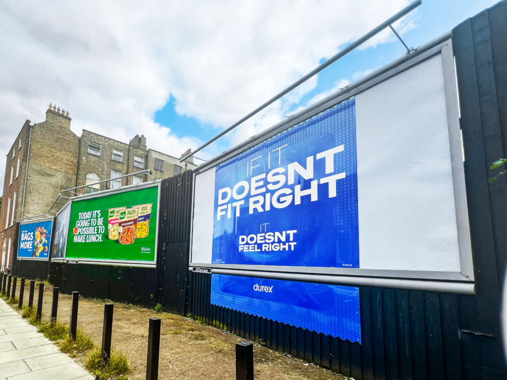 To highlight its new Condom Fit & Sensations campaign, Durex has erected a series of clever and eye-catching billboards across Dublin. With the advertisements spilling out beyond the boundaries of their frames, the designs serve as a visual representation to reveal that the public could be wearing ill-fitting products.