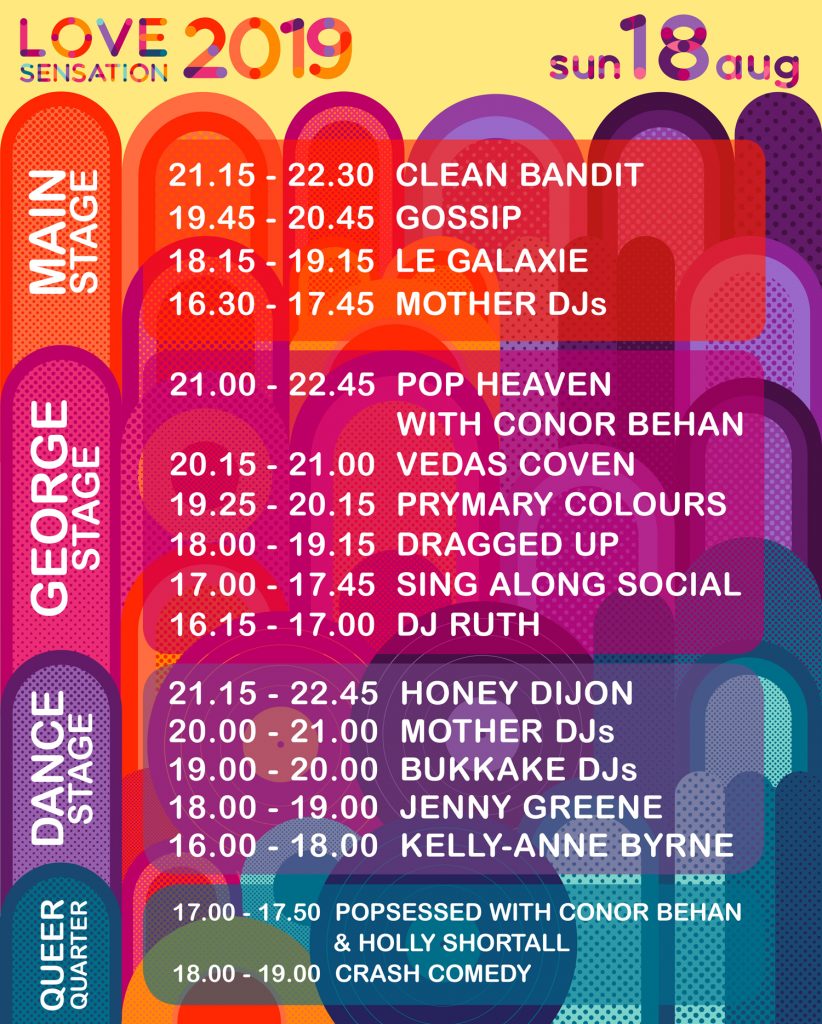 Sunday will see Gossip at 19:45 and Clean Bandit finish out the festival at 21:45.