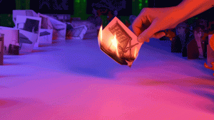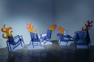 The screens serve to partition the gallery, guiding viewers towards the far corner, to a recreated living space. The walls display two near-lifesized black and white photographs of living spaces with cushions strewn on the floor. To the right of the gallery are five life size cardboard cutouts of colonial military furniture. Each piece of furniture is set alight by cardboard orange and red flames, contrasting against the black and white images.
