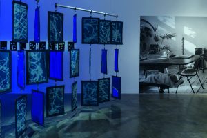 Upon entering the gallery immediately the viewer is struck by a series of suspended screens. The screens consist of 15 panels of erratically bleached denim. Each panel is uniquely designed. Occasionally the denim is backed by a turquoise material reminiscent of shell suits from the 1990s, others are emblazoned with gold graffitied text with slogans such as, “No More Genius Bullshit”. Many are adorned with clusters of badges with black and white photographs of lesbian women from the 1920’s and ‘30s or images of modernist buildings and furniture and their respective blueprints.
