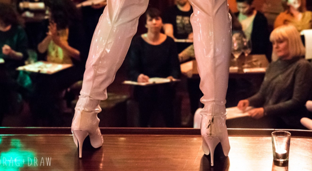 A fun and informal life drawing session with a drag queen model, taking place between 5 pm – 7 pm. Basic materials provided. First come first served