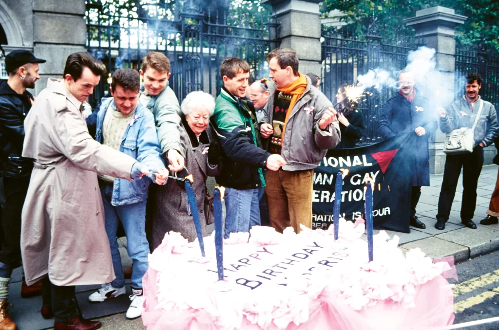 Image from the Irish Queer Archive show community memebers lighting candles on a large birthday cake.
