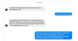 It all began when the club received a mail wondering: “Is it safe here? Because my friend will celebrate her bachelorette party.” When the club were unsure what the question entailed, the hen party organiser replied, “I do respect LGBT community. But I’m worried about HIV infection. Because a lot of gay nowadays are vulnerable to HIV. I’m just worried that a lot of gays coming there has HIV.”