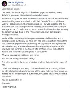 The social media manager of Manila’s Nectar Nightclub not only shared the mails from a hen party asking if they would be safe from HIV but also used the occasion to publish a post about ignorance addressed to “Dear Straight Bigots”.
