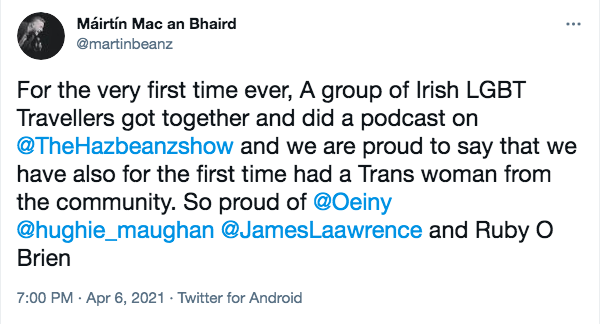 Mac an Bhaird announced the groundbreaking collaboration on Twitter, revealing that several prominent LGBTQ+ Travellers would be featured on the episode, which explores the diverse and varied issues that are currently facing the LGBTQ+ Traveller community.