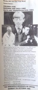 McEvoy’s connections were not limited to Irish organisations. During the 1980 Gay Pride Week, McEvoy succeeded in bringing Vito Russo to the Hirschfeld Centre to speak about his latest book, Celluloid Closet. While a few years later, in October 1984, thanks to the support of the British Film Institute, Terence Davies came to speak at the Hirschfeld Biograph on his acclaimed trilogy of films, Children, Madonna and Child, Death and Transfiguration. Of all the films that were screened in the Hirschfeld Biograph, Davies’ generated the most positive reviews and attention outside the gay community. Ray Comiskey, writing in the Irish Times, gave considerable attention to Davies’ trilogy, noting that “Hirschfeld Biograph club members will have an opportunity to see a marvellous piece of film.”
