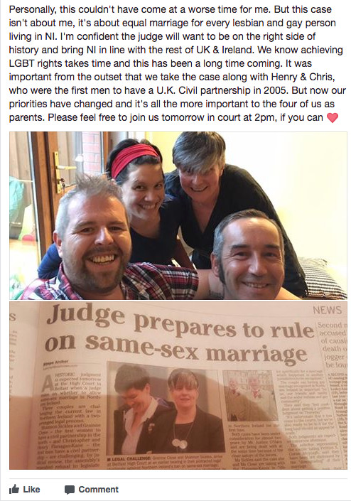 In a message on Facebook, Close spoke about the renewed importance of marriage equality, especially as a parent. “Personally, this couldn’t have come at a worse time for me. But this case isn’t about me, it’s about equal marriage for every lesbian and gay person living in NI.