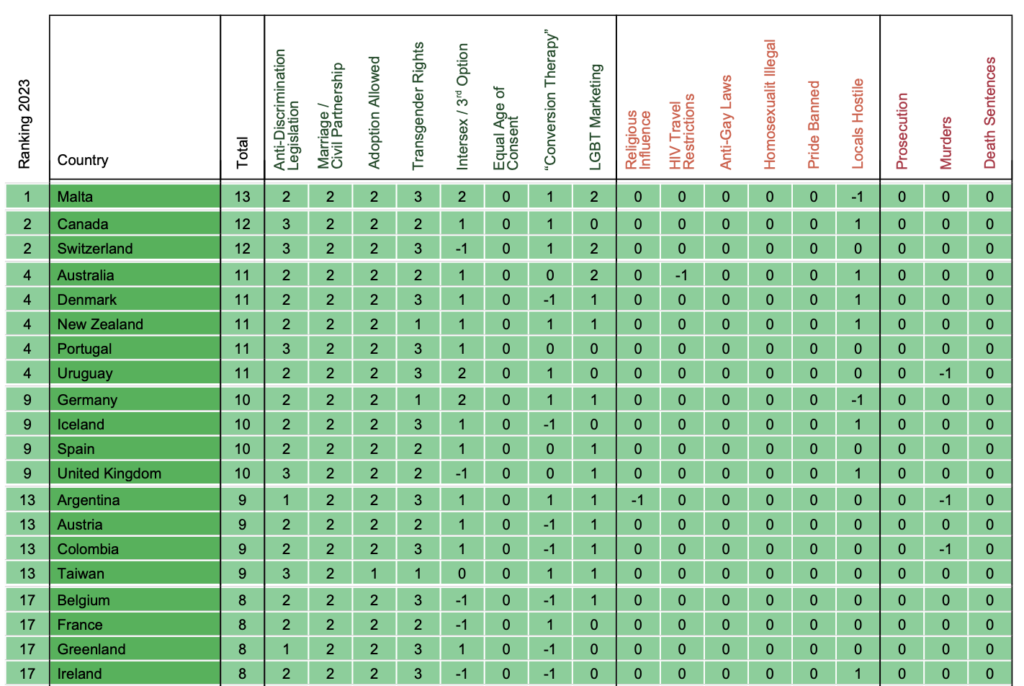 It assesses the laws and living conditions for LGBTQ+ people in each country based on 17 components ranging from marriage equality to laws that criminalise homosexuality. Points are awarded for positive categories like anti-discrimination legislation, transgender rights, and intersex gender recognition, and deducted for negative factors like religious influence, HIV travel restrictions, and Pride bans.