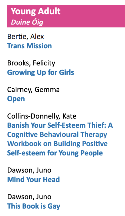 In this screenshot from the Healthy Ireland list, a whole section of books are clearly categorised as “Young Adult,” including This Book Is Gay by Juno Dawson.