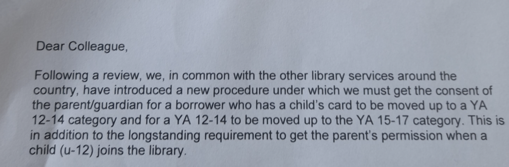 The library staff member we spoke with said, “Previously if say a 17-year-old joined for the first time they would be issued with 15-17 card. Now we’re being told to issue them a 0-11 borrowing card unless a parent gives signed consent for the appropriate card to be issued.”