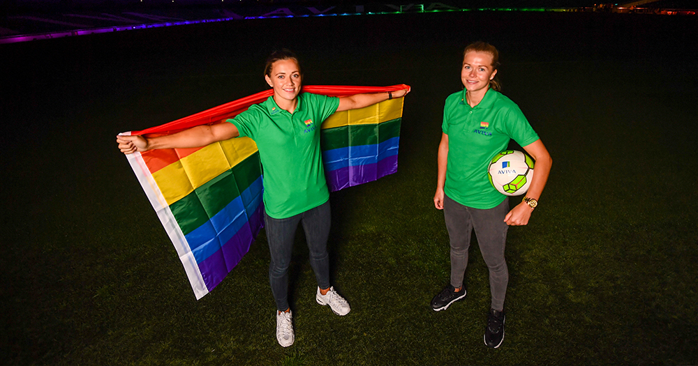 Katie McCabe, left, and Ruesha Littlejohn in attendance at the launch of Aviva Pride where for the first time in Irish history, Ireland’s largest insurer is lighting up the iconic home of Irish soccer and rugby with the colours of Pride. See www.aviva.ie/pride or follow #SafeToDream on social media to find out more.
