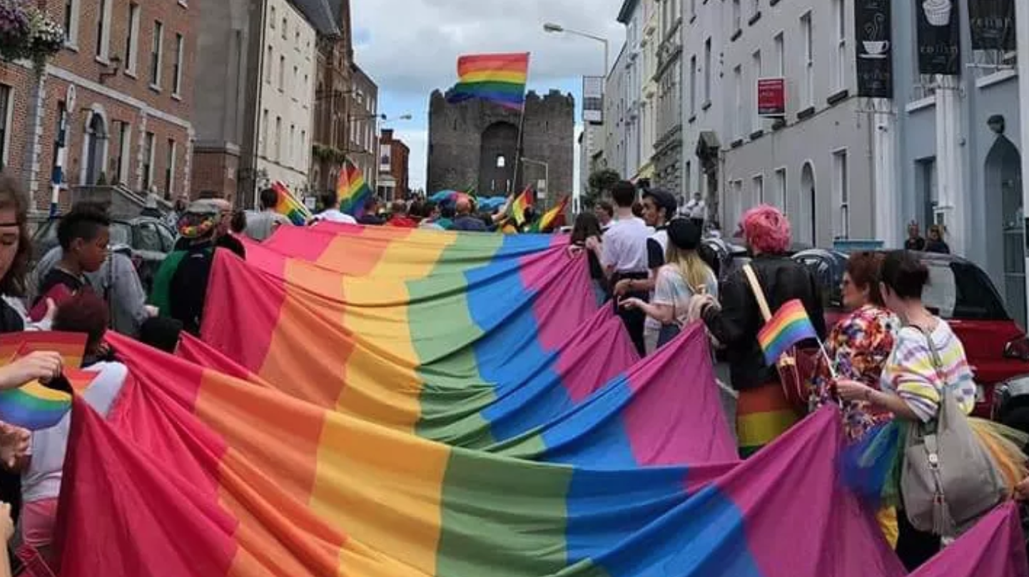 Group of people with Pride flag supporting LGBTQ+ charities in Ireland.