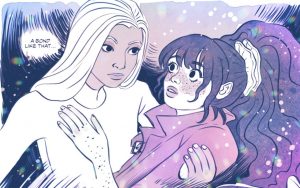 A more recent book I thoroughly enjoyed is Alien Heart. Originally released as a webcomic, creator Anna Fitzpatrick funded a collected edition (volume one) via Kickstarter. It is set in a future where the earth has been crushed, destroyed and dominated by mysterious creatures called ‘angels’ and humanity lives in a protected bubble. This is where we find a scruffy, queer character called Ivy. She’s a teenager who finds it difficult to fit in with everybody else due to being different (and is mistreated for being so). This all changes when she meets Rosa who she instantly befriends but then Rosa disappears and Ivy has to try and save her. It’s a beautifully drawn story with believable characters and a wonderfully rendered setting.