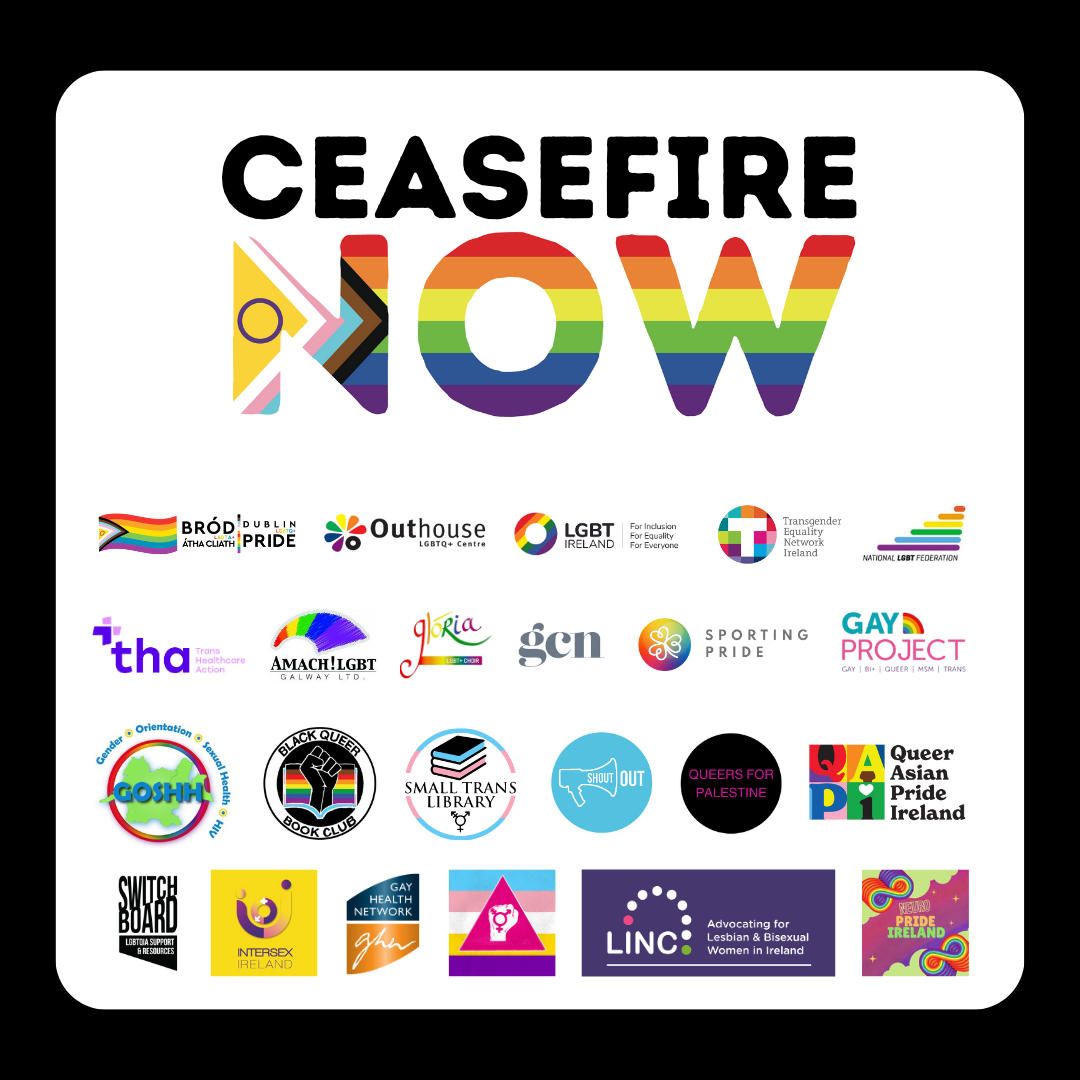Published today, February 29, as many as 23 Irish LGBTQ+ organisations have joined forces to pen an open letter calling for a ceasefire amidst the ongoing violence in Gaza. Among the organisations calling for a ceasefire are ShoutOut, LGBT Ireland, TENI, Queer Asian Pride Ireland, the National LGBT Federation (NXF) and GCN.