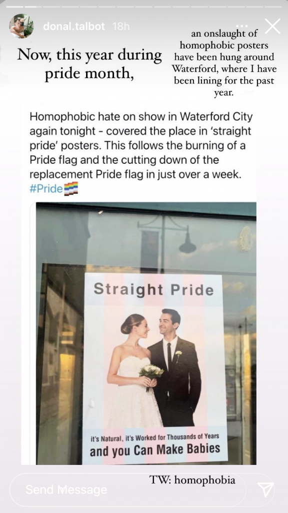 The latest of which is a miserable series of “straight pride” posters being plastered around the town as highlighted in Donal’s Instagram stories.