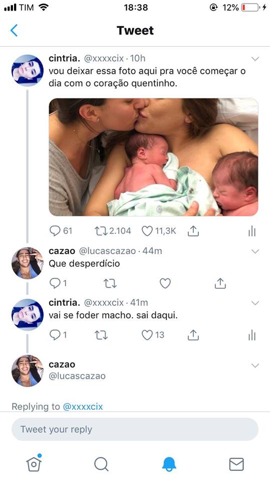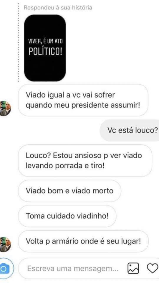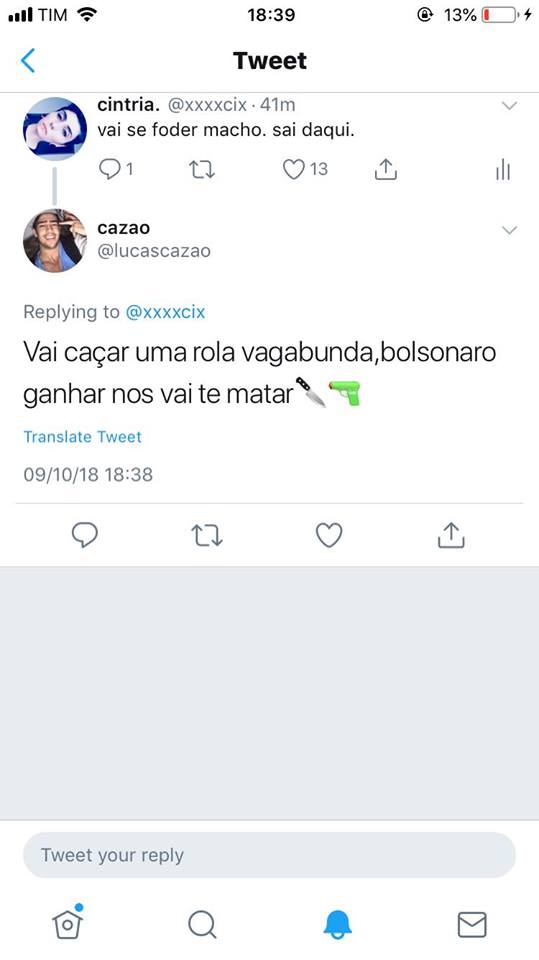 The person responded again saying, “Go and hunt for a dick, bitch! Bolsonaro winning we will kill you”