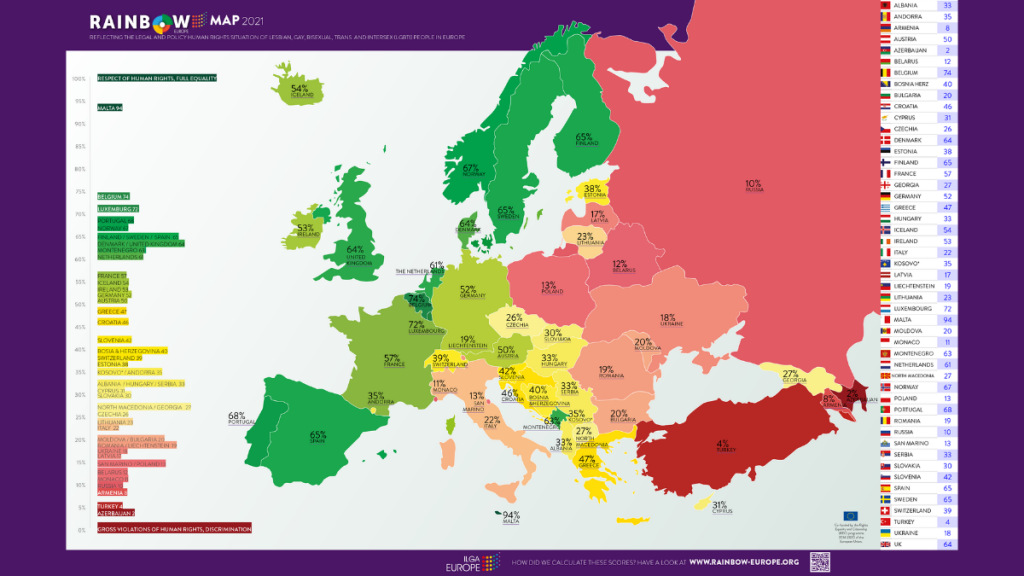 This year’s Rainbow Europe Map and Index – published on Monday, May 17 2021 – revealed that over the past 12 months there have been minimal advances in LGBTQ+ rights.