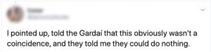 The man wrote on Twitter, “As me, my mother, the Guards, and the security man of the Osprey, stood beneath the window where the abuse had came from, we saw scuttling in the room: people creeping out from behind the curtains, and running back and forth. I pointed up, told the Gardaí that this obviously wasn’t a coincidence, and they told me they could do nothing.”