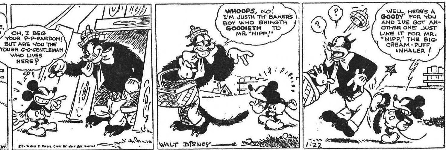 The 1931 comic shows Mickey visiting Kat Nipp, a cat with a spring in his step and an obvious lisp. The feline reeks of that old gay stereotype, so what does Mickey do? Kicks him in the arse of course! Oh, the hilarity. *cough*