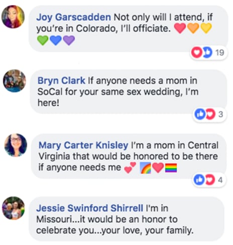 Earlier this week on Facebook, Cunningham offered to attend any LGBT+ wedding as a “stand-in mom” for those whose parents have failed to recognise or accept their marriage.