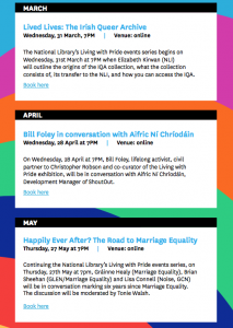All Living with Pride events will be free but registration is essential. They include virtual talks, readings, workshops, panel discussions and events for children and young people. The series begins on Wednesday 31st March with a talk by Elizabeth Kiernan outlining the origins of the Irish Queer Archive collection. The series will also feature a panel discussion on 28th May, marking six years since Marriage Equality and featuring GCN’s own Lisa Connell.