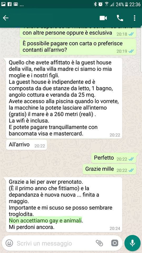 Following the booking request on Booking.com the couple was contacted on WhatsApp by the owner of the guest house, who requested more info about them. After few message exchanges, the owner thought it was appropriate to let them know the ‘house rules’ with the following message: “Thank you for your reservation. This is the first year that we are renting [the guest house]. Important note: apologies if I may come across as a caveman, but we do not accept gays or pets.”
