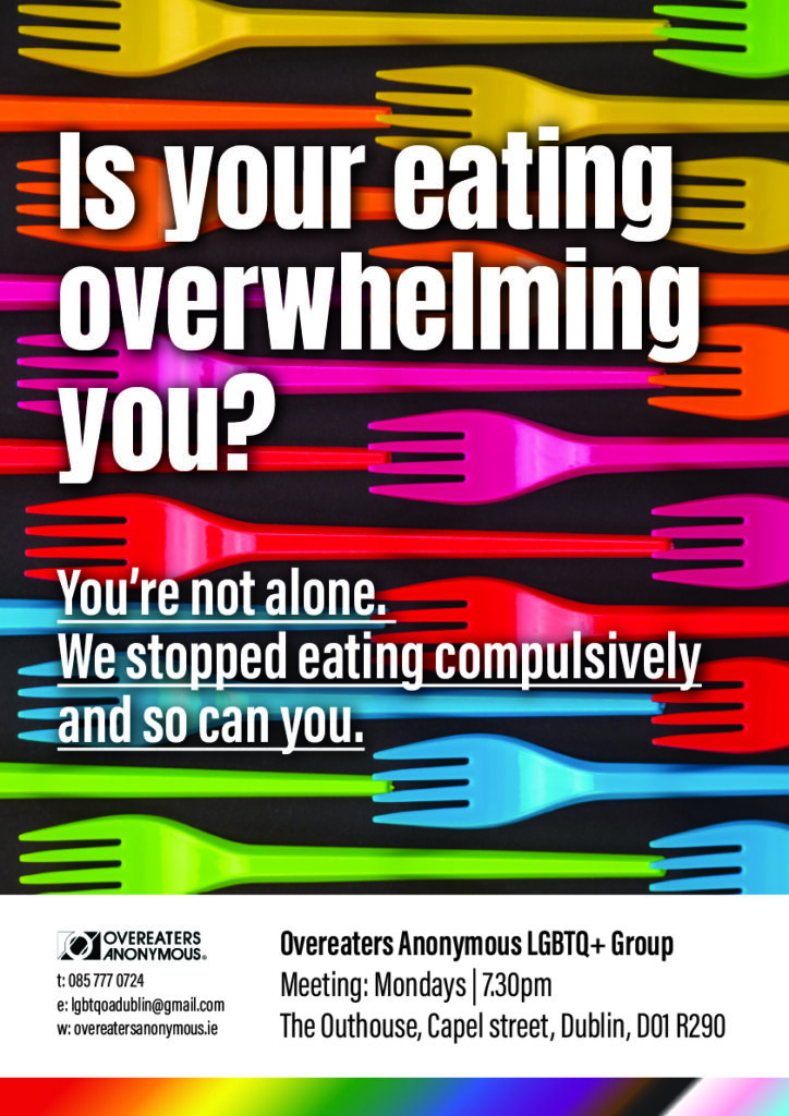 Overeaters Anonymous is a peer support group for individuals struggling with compulsive eating. In February 2025, a new meeting for LGBTQ+ people started in Outhouse, Dublin, which now runs every Monday from 7:30pm to 8:30pm.