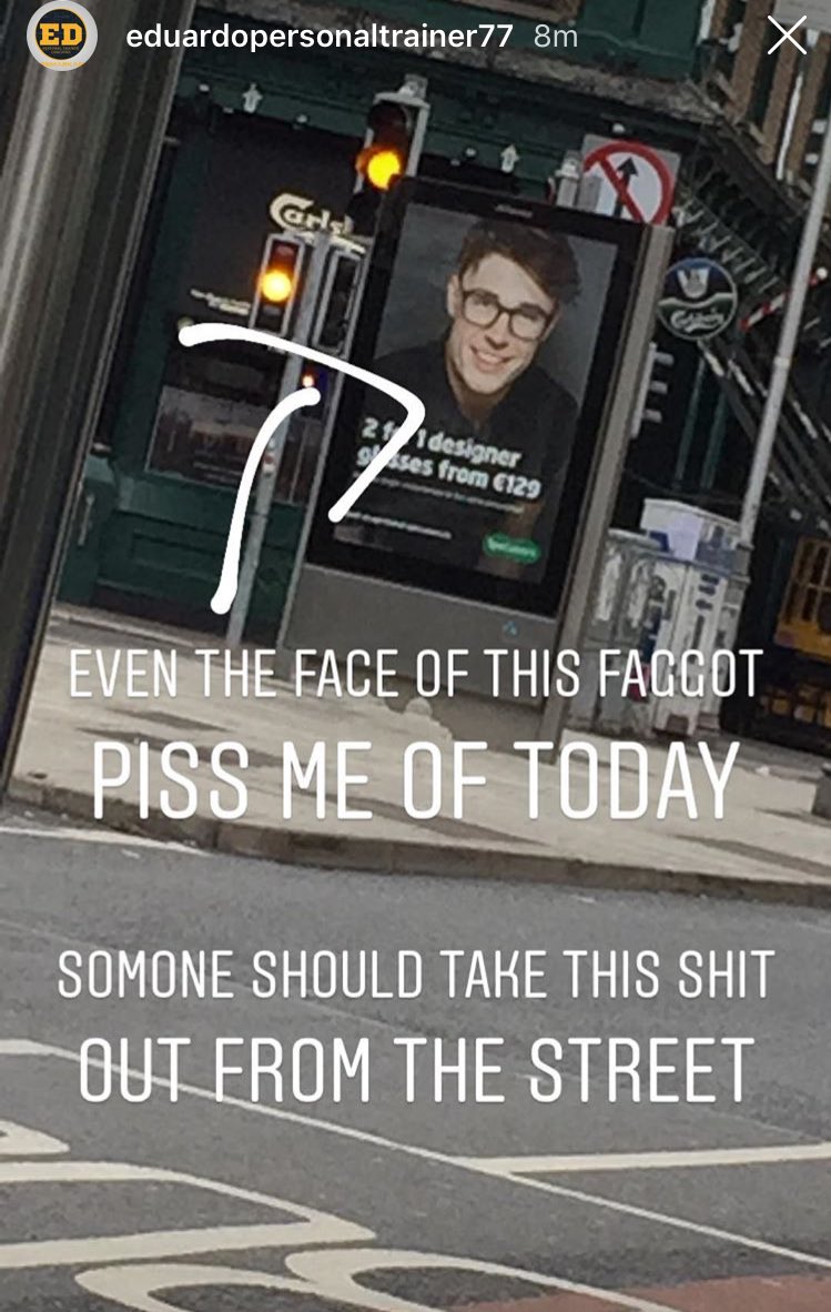 In the caption on the personal trainer’s instragram story, he wrote, “even the face of this faggot piss [sic] me off today. Somone [sic] should take this shit out from the street.”