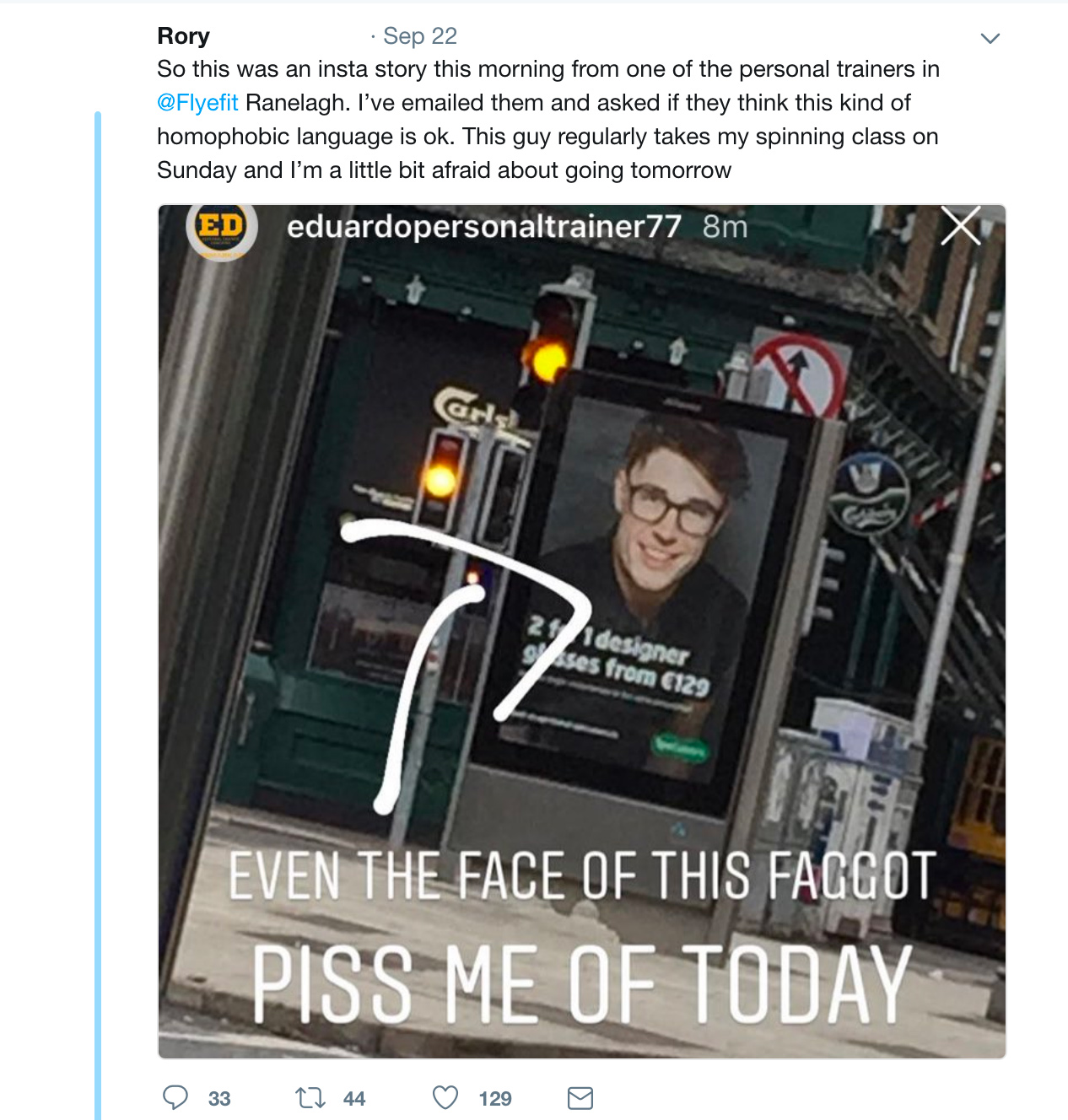 “So this was an insta story this morning from one of the personal trainers in @Flyefit Ranelagh. I’ve emailed them and asked if they think this kind of homophobic language is ok. This guy regularly takes my spinning class on Sunday and I’m a little bit afraid about going tomorrow.