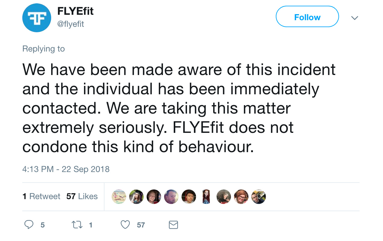 FLYEfit replied to the thread on Twitter saying, “We have been made aware of this incident and the individual has been immediately contacted. We are taking this matter extremely seriously. FLYEfit does not condone this kind of behaviour.”