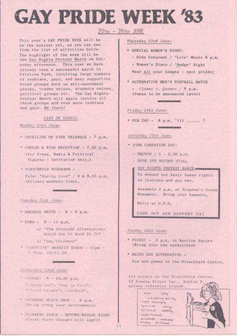 Flyers like the one above were distributed to inform members of the LGBT+ community that this wasn’t just a one-day event. They had a whole host of events laid out for ‘Gay Pride Week 83’.