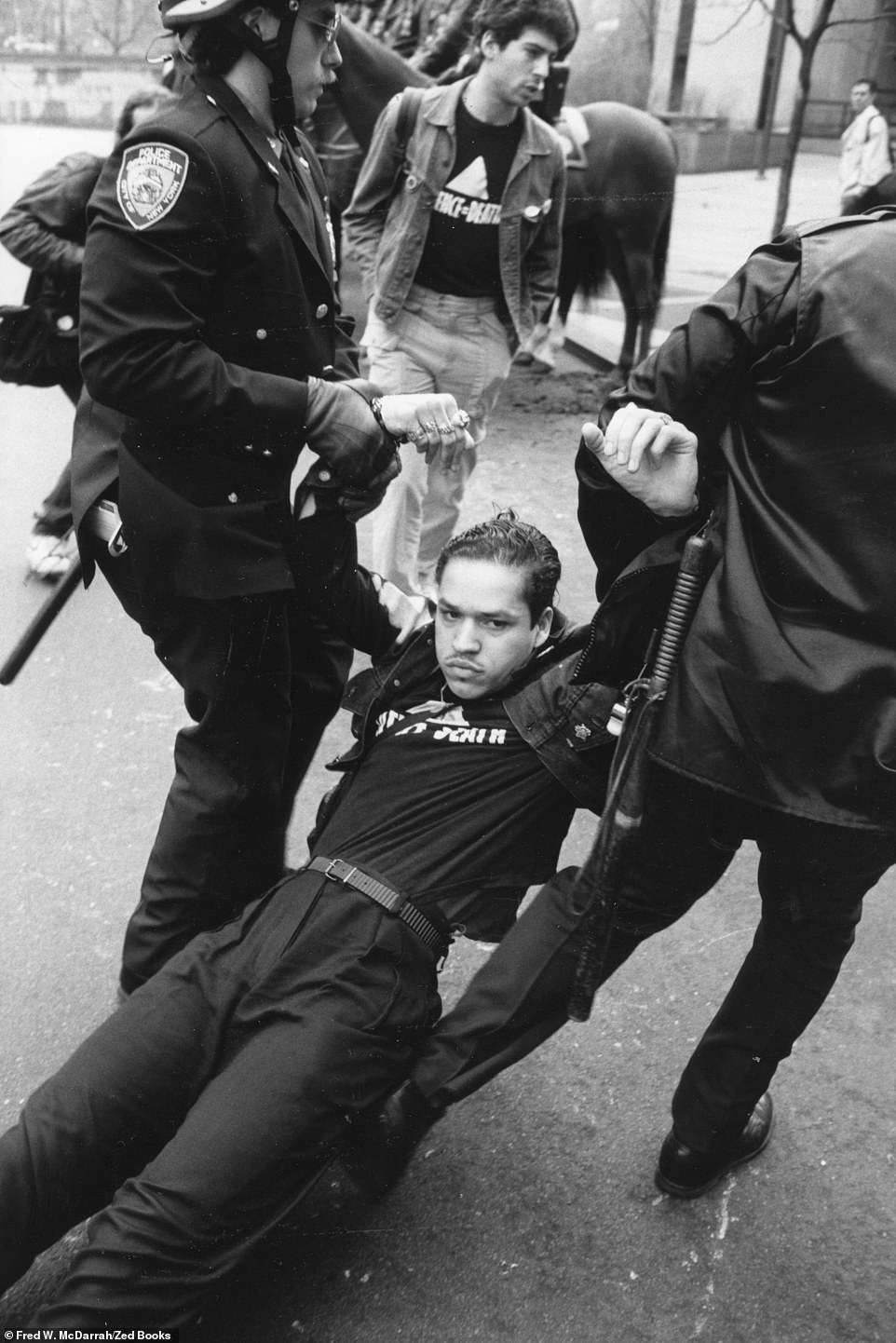 In the above photo, New York police drag a member of the AIDS Coalition to Unleash Power group, also known as ACT UP. The group fight to end the AIDS pandemic and improve the lives of people with AIDS through direct action.